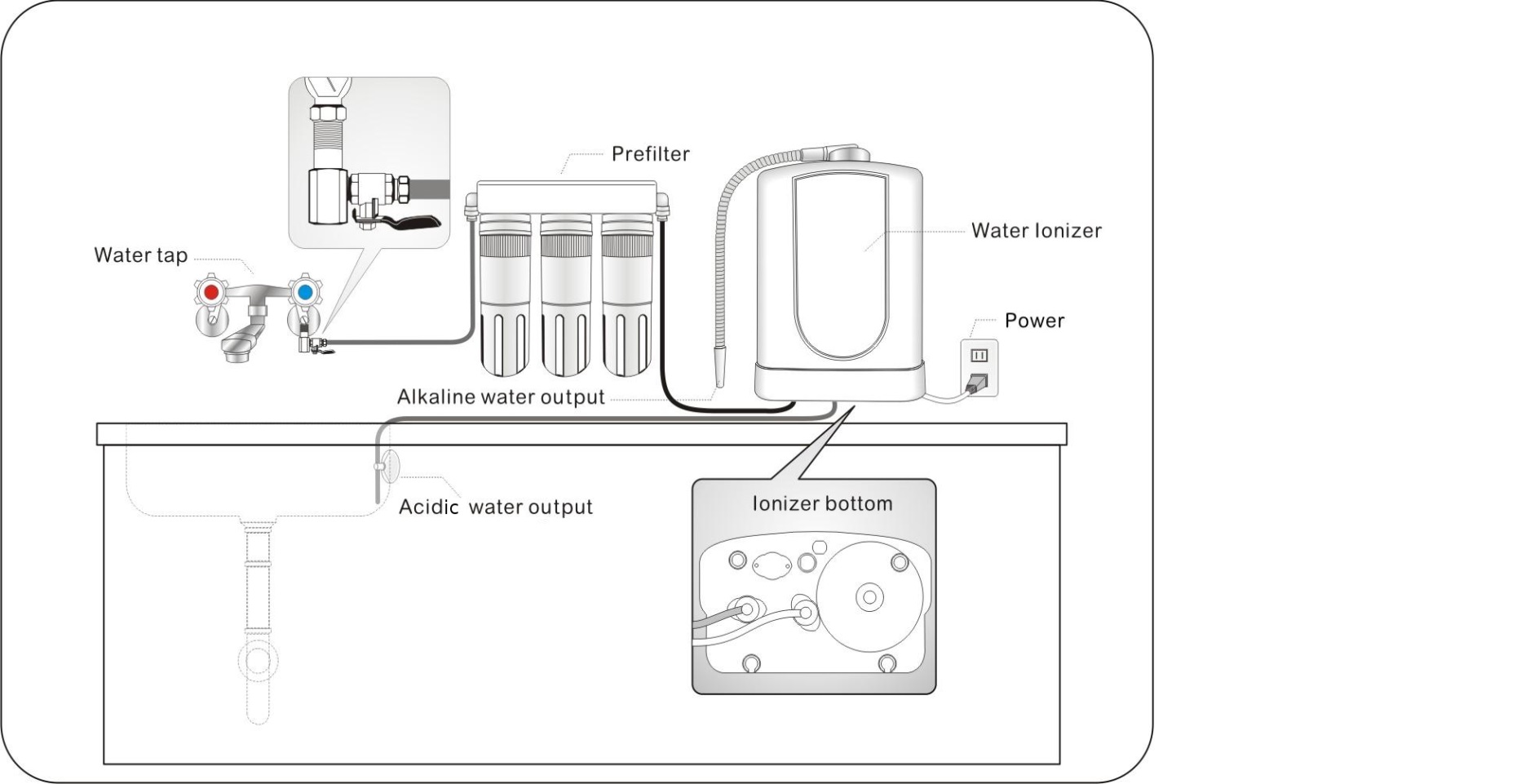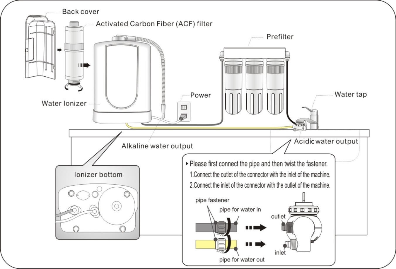 เครื่องแยกน้ำด้วยกระแสไฟฟ้าจะแยกน้ำให้เป็นประจุไอออนโดยใช้ไฟฟ้ากระแสตรง น้ำที่ไหลผ่านก๊อกน้ำมายังเครื่องแยกน้ำด้วยกระแสไฟฟ้านี้ น้ำจะได้รับการกรองด้วยแอคทิเวทเต็ดชาโคล(activated charcoal) ในลำดับแรกก่อน